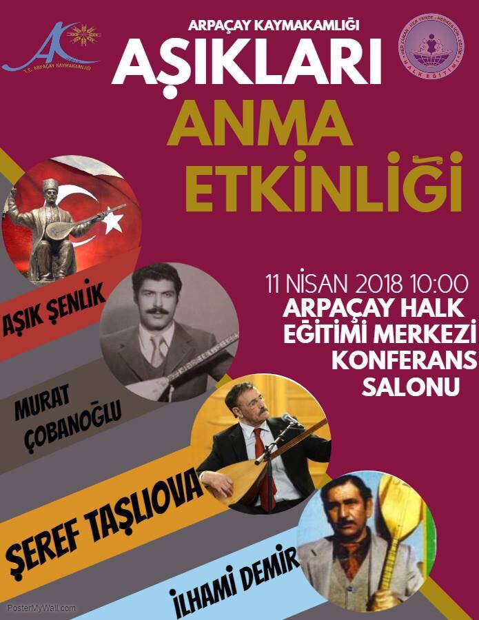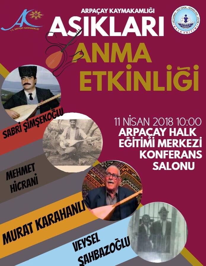 Arpaçay Kaymakamlığı tarafından 11 Nisan 2018 Çarşamba günü aşıkları anma etkinliği düzenlenecektir.