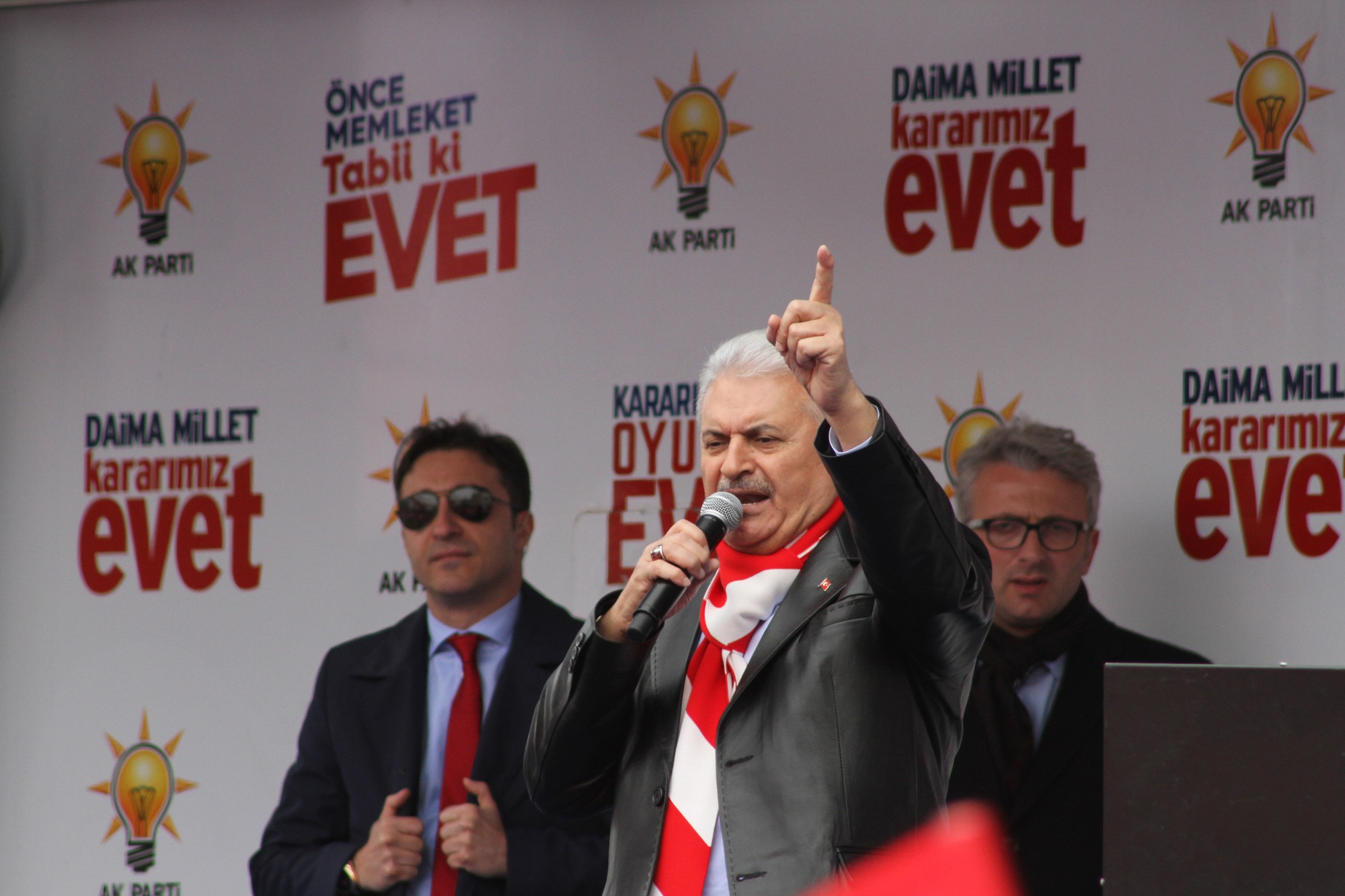 Cumhuriyet Meydanı’nda halka seslenen Başbakan Binali Yıldırım’a 16 Nisan’da yapılacak referandumda Karslılardan ‘evet’ desteği geldi. Cumhuriyet Meydanı’nda Karslılara seslenen başbakan Binali Yıldırım, "Bu mesele Tayyip Erdoğan meselesi değil, bu mesele Binali Yıldırım meselesi değil. Bu sistem Erdoğan için lazım değil, bu sistem her doğan için lazım. Mesele memleket meselesidir. Mesele Türkiye meselesidir. Mesele istiklal ve istikbal meselesidir. Hepimiz biliyoruz ki Recep Tayyip Erdoğan’ı tehdit eden ülkeler, aslında Türkiye’yi tehdit ediyor. Bunu biliyoruz. Avrupa’nın tavırlarını görüyorsunuz. FETÖ’cülerin tavırlarını görüyorsunuz. Terör örgütü PKK’nın hayır kampanyalarını görüyorsunuz. 16 Nisan’da ülkemiz için, Recep Tayyip Erdoğan için omuz omuza var mıyız?" dedi.