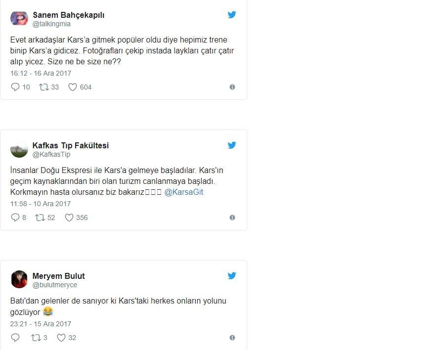 Son dönemde herkes bütün bu güzelliği görmek, kıskanılası doğayı yaşamak ve doyumsuz lezzetleri tatmak için Kars’a akın ediyor. Öyle ki sosyal medyanın en popüler platformu Twitter’da Kars’a ilişkin tweet’ler atılıyor.