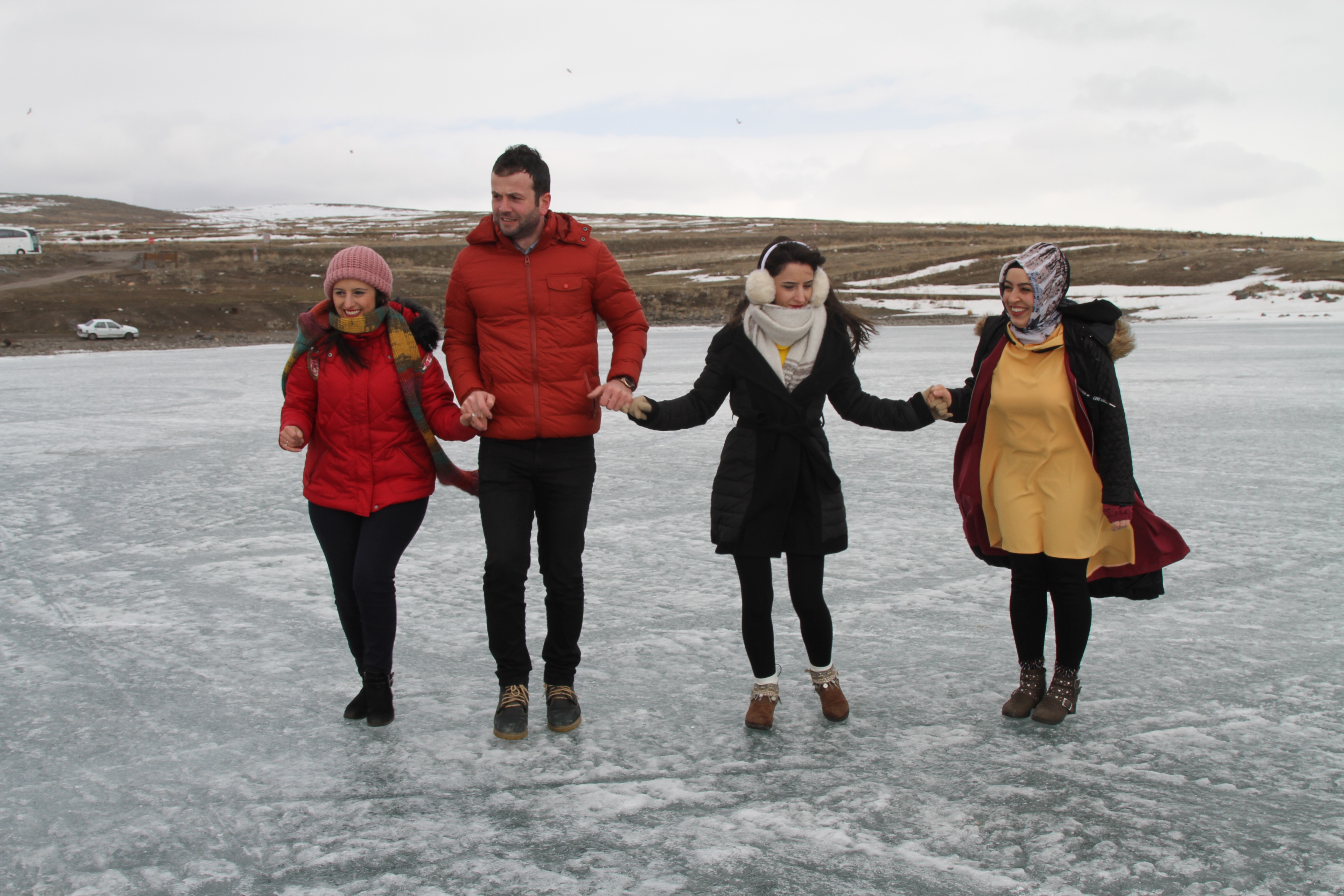 Kışın yüzeyi tamamen buz tutan Çıldır Gölü yerli ve yabacı turistlerin yoğun ilgisini çekiyor. Doğu’ya ilk defa geldiklerini söyleyen 4 kişilik ekipten oluşan gençler her hafta sonu sürekli olarak gezi düzenleyerek seyahat ediyorlar. Arkadaşları olan Ayşegül İçden’in Çıldır gölünü görmeyi çok istediğini, onun için bir sürpriz yapıp doğum gününe denk getirerek buz tutan göl üzerinde pasta keserek kutlayan gençler daha sonra buz üzerinde horon teptiler.