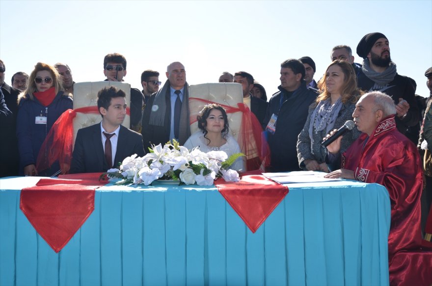 Şenlik kapsamında atlı kızaklarla alana gelen Hilal Yaycı ve Özgür Koçak çifti buz üstüne konulan masaya oturdu.