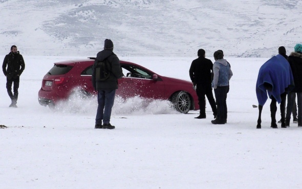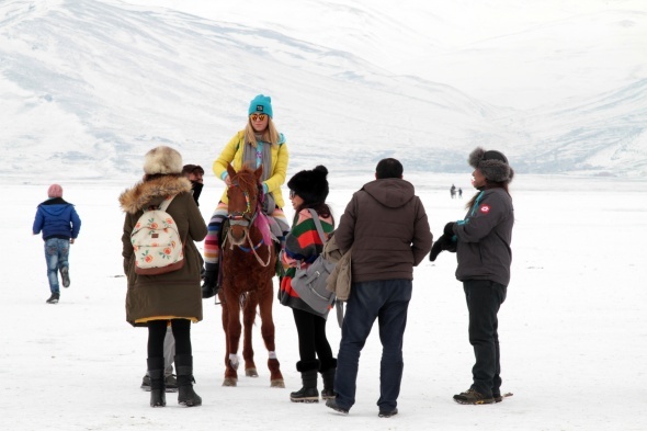 Karın, buzun ve beyazın güneşle kucaklaştığı Çıldır Gölü yerli ve yabancı turistlerin akınına uğradı.
