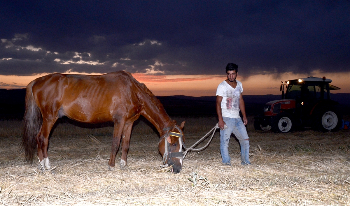 Akşam serinliğini fırsat bilerek tarlalara giden çiftçiler, traktör, biçerdöver ve at tırmıklarıyla hasat yapıyor.