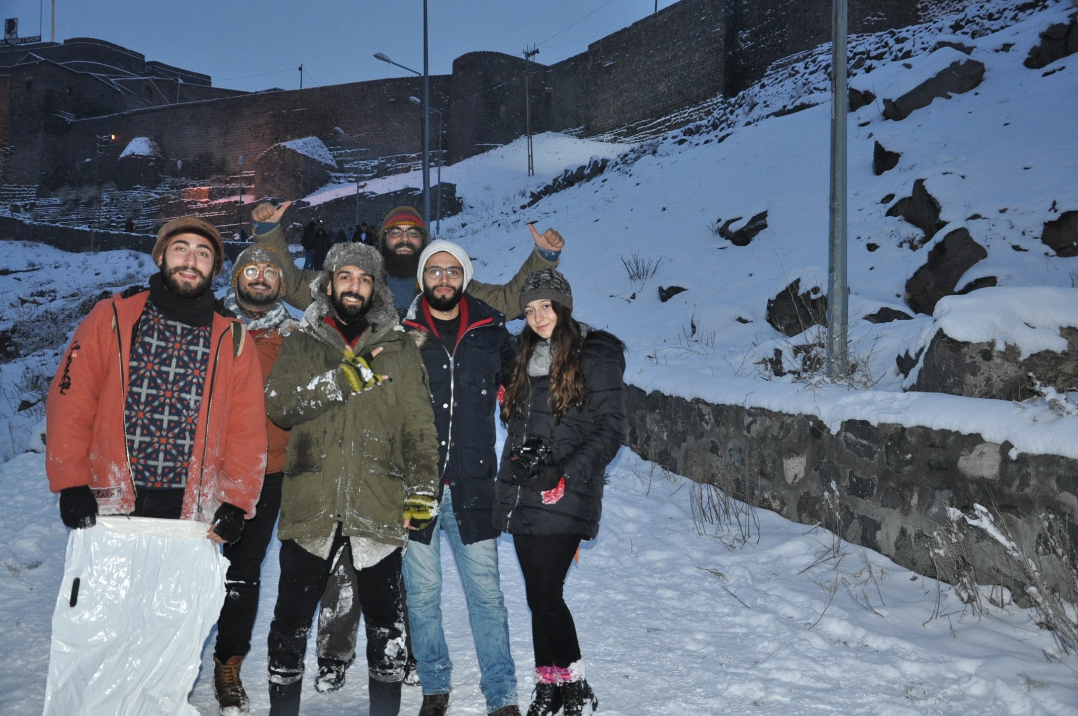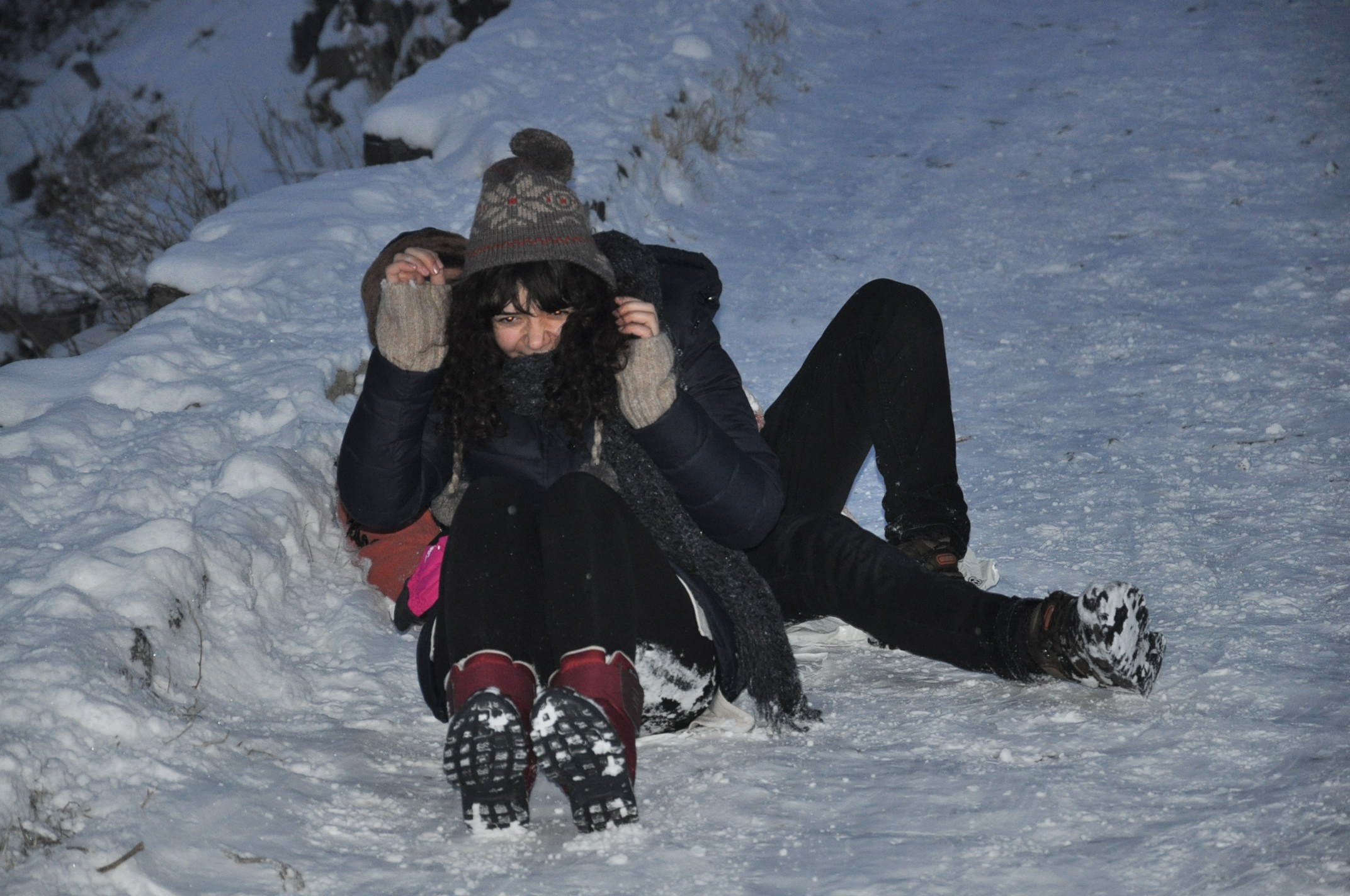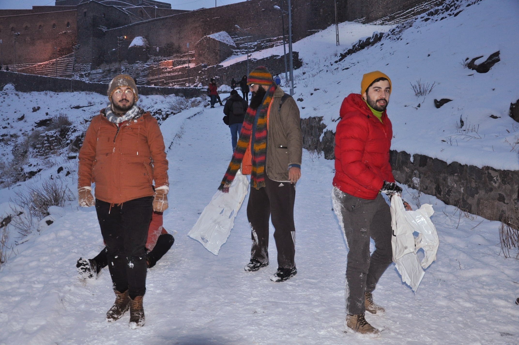 Türkiye’nin çeşitli illerinden gelerek Ankara’da buluşan üniversite öğrencilerinin Doğu Ekspresi'yle Kars’a yolculukları devam ediyor. Her gün yüzlerce vatandaşın geldiği kentte hayatlarında ilk kez bu kadar çok karı bir arada gördüklerini söyleyen gençler, Kars Kalesi’ne çıkarken buradaki yokuşta kaymaya başladı. Ellerinde bulunan naylon poşetleri yırtarak altlarına koyan gençler Kars Kalesi eteklerinde saatlerce kaydı.