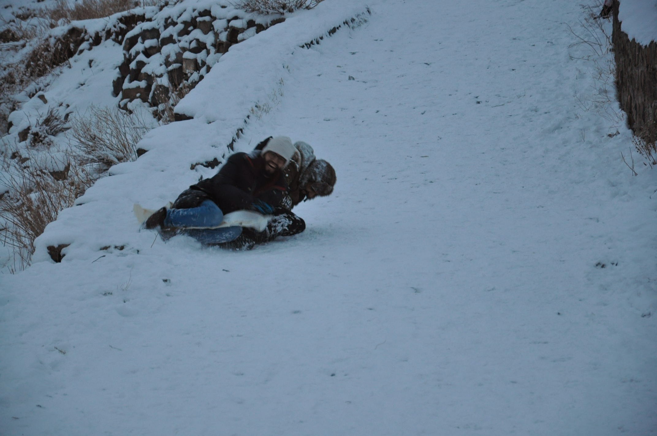 Kars Kalesi’nin yokuşunu kayak pistine çeviren gençler, kızak yerine naylonları kullandı. Gençlerin keyfi renkli görüntüler ortaya çıkardı. Düşe kalka defalarca yokuş yukarı çıkarak kayan gençler, bazen de önlerde kayan arkadaşların çaparak durabildi.
