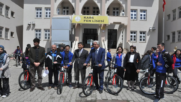 Kars Fen Lisesi önünde toplanan yaklaşık 150 öğrenci, okul müdürü Müseyip Arslanbenzer, ile 4 kilometre pedal çevirdi. 11 Mayıs Dünya Oryantrik Günü dolayısıyla düzenlenen etkinlik çerçevesinde Azat Köyü İlkokulu’na öğrenciler bisikletleriyle geldi. İlkokul öğrencileriyle bir araya gelen lise öğrencileri, minik öğrencilere yaş pasta kesti, çeşitli hediyeler verdi.
