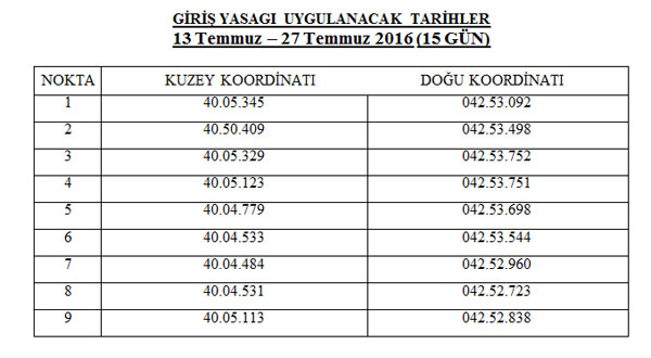 Kars ili Kağızman ilçesi sınırları dahilinde bulunan ve aşağıda koordinatları belirtilen bölge, 13 Temmuz - 27 Temmuz 2016 tarihleri arasında (15...