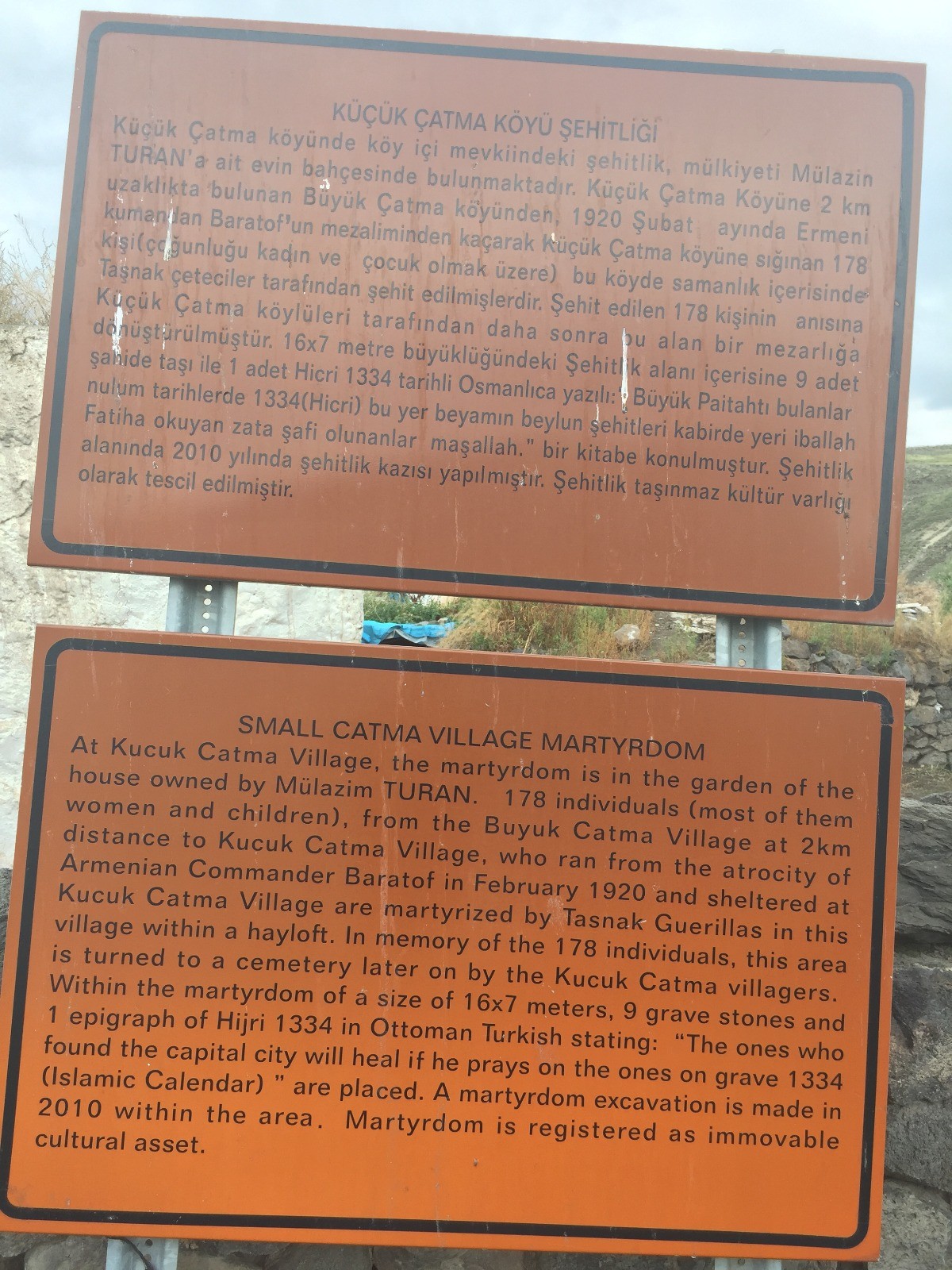1920 yılının Şubat ayında Ermeni kumandanı Baratof'un mezaliminden kaçarak Küçük Çatma köyüne sığınan çoğu çocuk ve kadınlardan oluşan 178 kişi Ermeni Taşnak çetecileri tarafından bir samanlığa doldurularak katledilmiş. Şehit edilen 178 kişi anısına Küçük Çatma köylüleri tarafından bu alan mezarlığa dönüştürülmüş ve 16x7 metre büyüklüğündeki şehitlik alanı içerisine 9 adet şahide taşı ile 1 adet Hicri 1334 tarihli Osmanlıca yazılı bir kitabe konularak koruma altına alınmıştı.