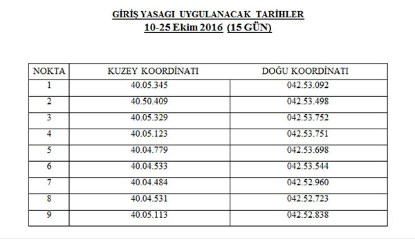 Kars ili Kağızman ilçesi sınırları dahilinde bulunan ve aşağıda koordinatları belirtilen bölge, 10-25 Ekim 2016 tarihleri arasında (15 gün süreyle)...