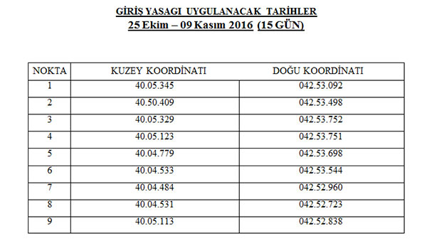 Kars ili Kağızman ilçesi sınırları dahilinde bulunan ve aşağıda koordinatları belirtilen bölge, 25 Ekim - 09 Kasım 2016 tarihleri arasında (15...