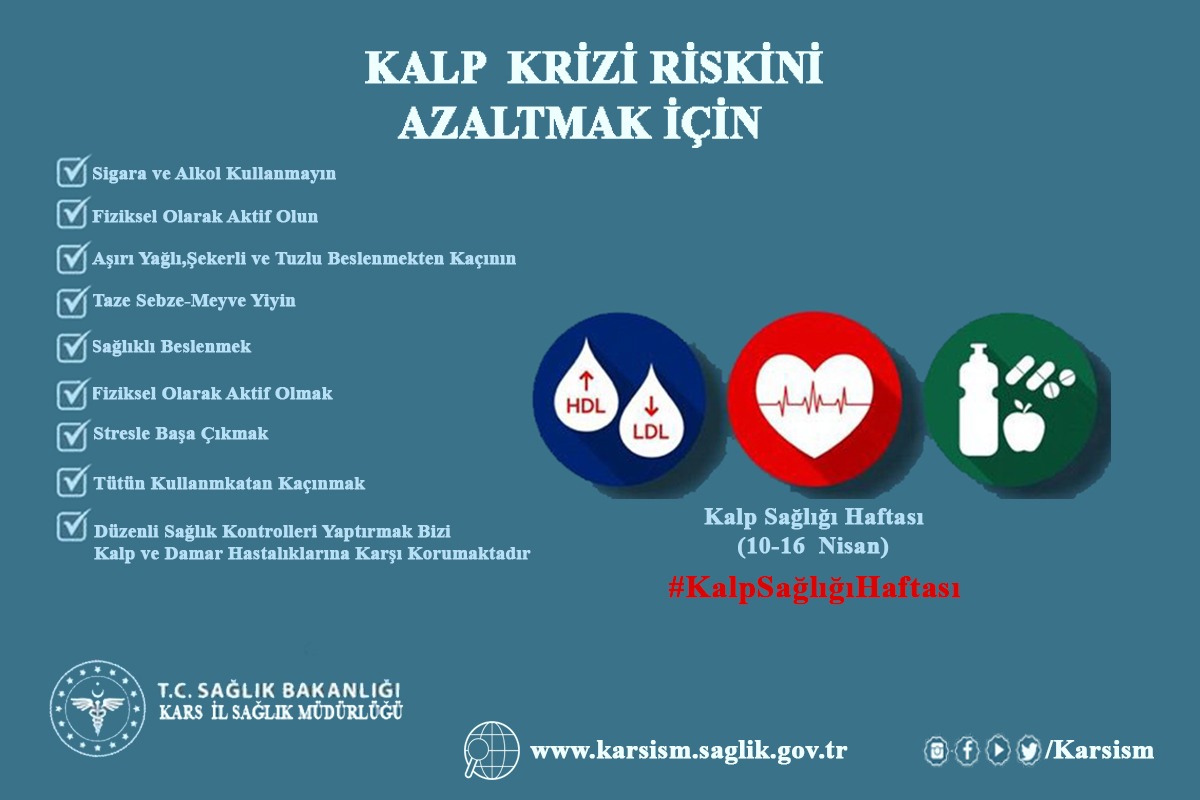 Kars Sağlık İl Müdürlüğü tarafından “10-16 Nisan Kalp Sağlığı Haftası” ile ilgili olarak yapılan açıklamada, bulaşıcı olmayan hastalıklarının yüzde 47'sinin kalp ve damar hastalıklarından kaynaklandığı ifade edildi.