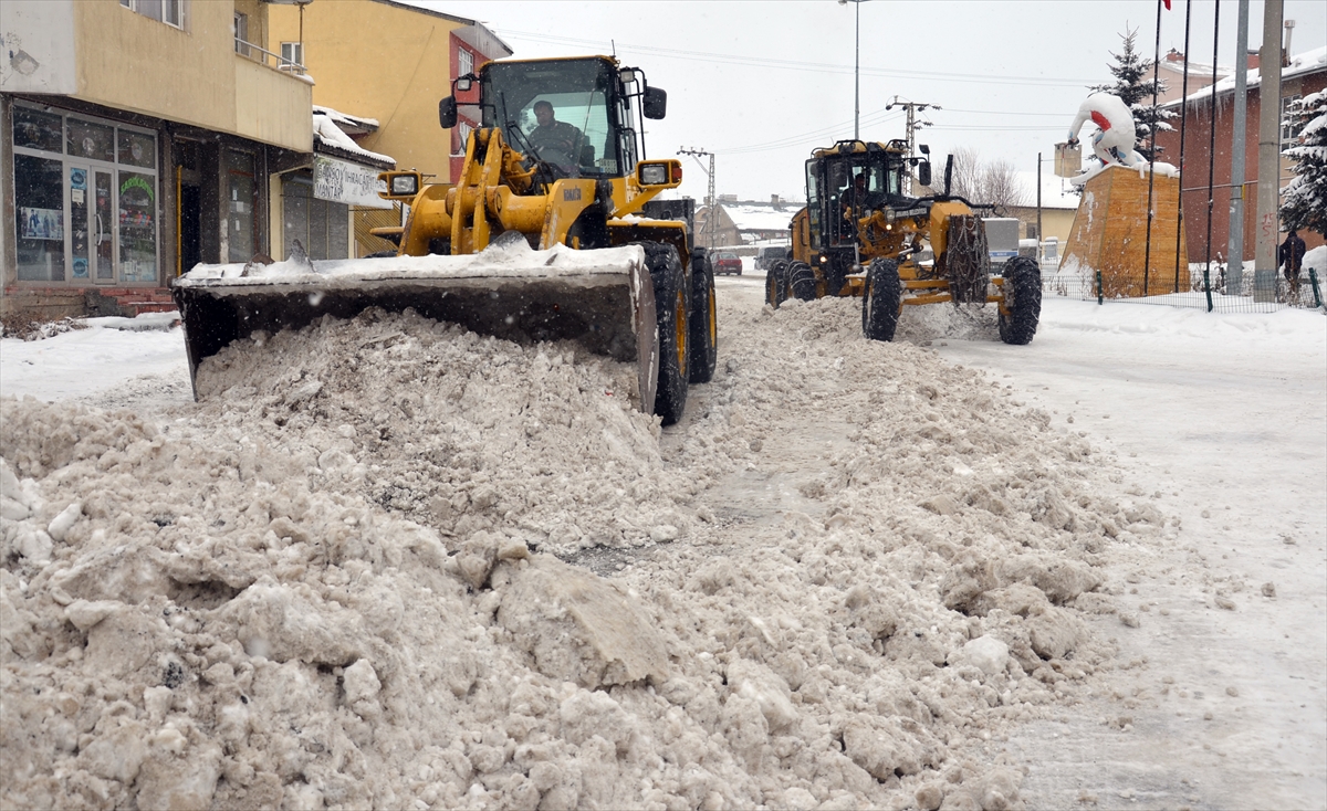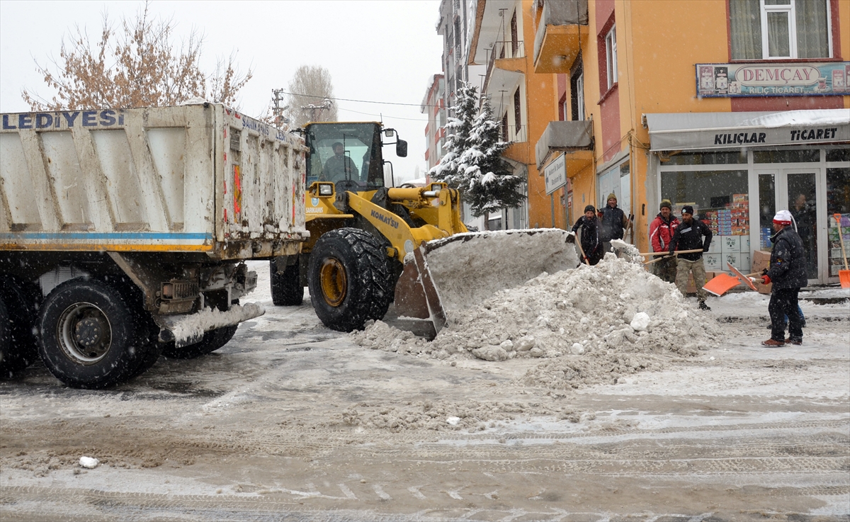 Kars'ın Sarıkamış ilçe merkezinde biriken karlar belediye ekiplerince temizlenerek kamyonlarla ilçe dışına taşınıyor