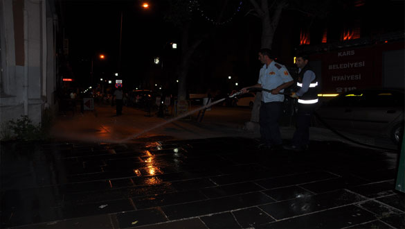Kars Belediyesi kente cadde ve kaldırımları yıkıyor. İtfaiye Müdürlüğü’ne bağlı ekiplerin kaldırımları tazyikli suyla yıkayarak, temizlik çalışması yapıyor.