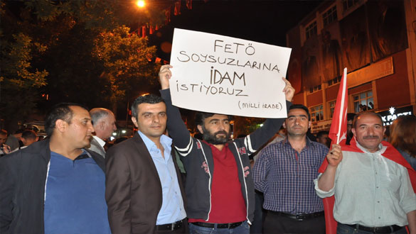 Öte yandan ‘demokrasi nöbeti’nde en çok dikkat çeken ise üzerinde ‘FETÖ soysuzlarına idam istiyoruz” yazılı döviz oldu. Vatandaşlarda üzerinde ‘idam’ yazılı dövizi taşıyan vatandaşlar alkışlarla destek verdi.