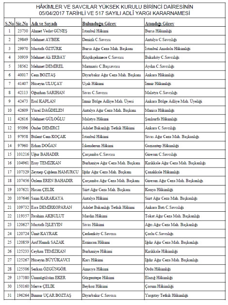 Hakimler ve Savcılar Yüksek Kurulu(HSYK), 517 sayılı adli yargı kararnamesiyle 31 hakim ve savcıyı yeni görevlerine atadı.