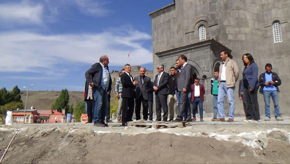 Kars’ta ‘Tarihi Dokunun Korunması’ Projesi kapsamında Evliya Cami bölgesinde Valilik, Devlet Su İşleri (DSİ) ve belediye tarafından yürütülen çalışmaları yerinde görmek ve yapılan çalışmalar hakkında bilgiler almak üzere Vali Yardımcısı, İl Özel İdaresi Genel Sekreteri Erdinç Dolu ile birlikte bölgeye gelen Vali Rahmi Doğan, DSİ 24. Bölge Müdürü Nesip Özden, Belediye Başkan Yardımcısı Arda Soner Tatlı ve ilgili firma yetkililerinden yürütülen çalışmaların son durumunu konuştu.