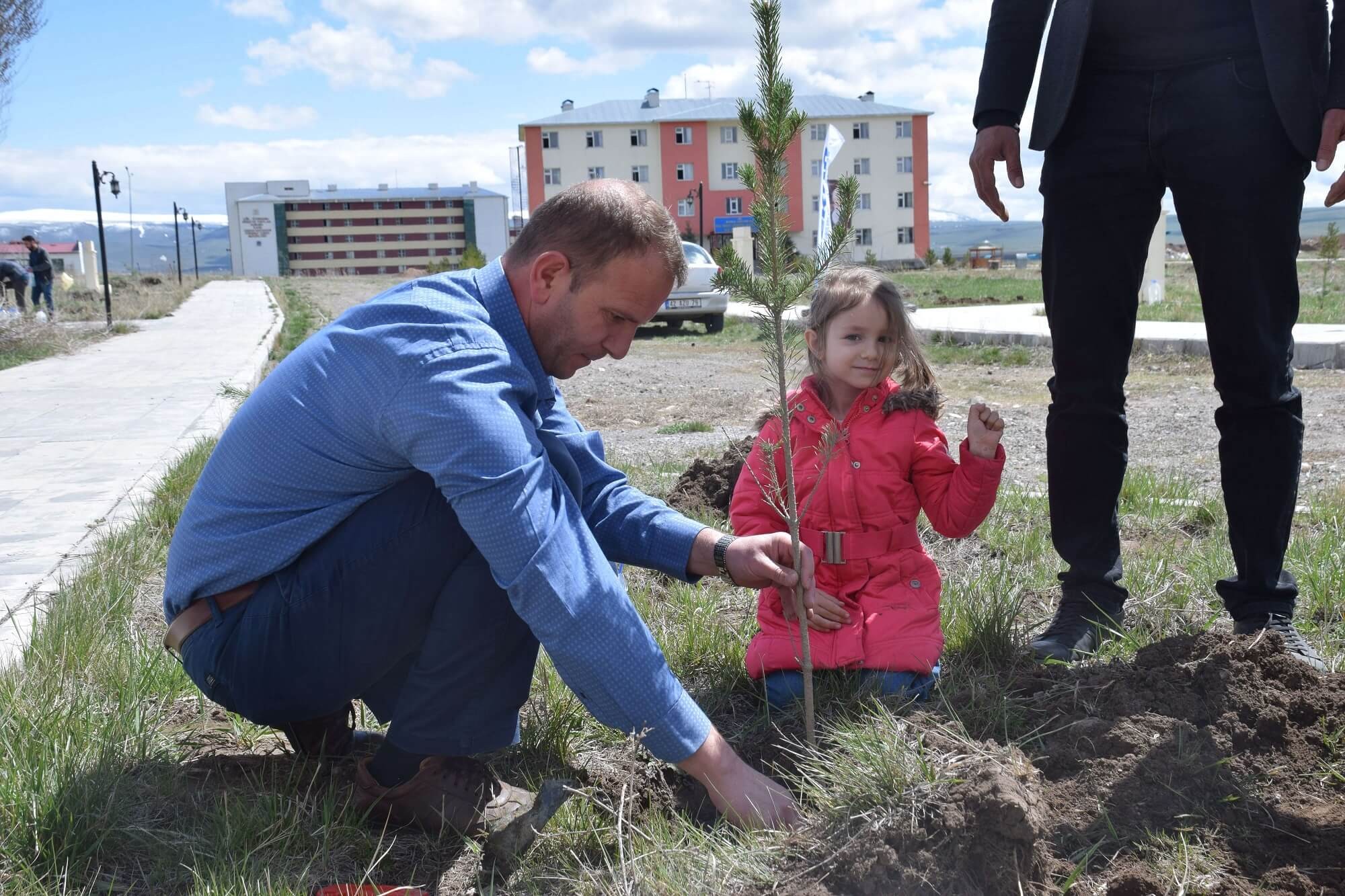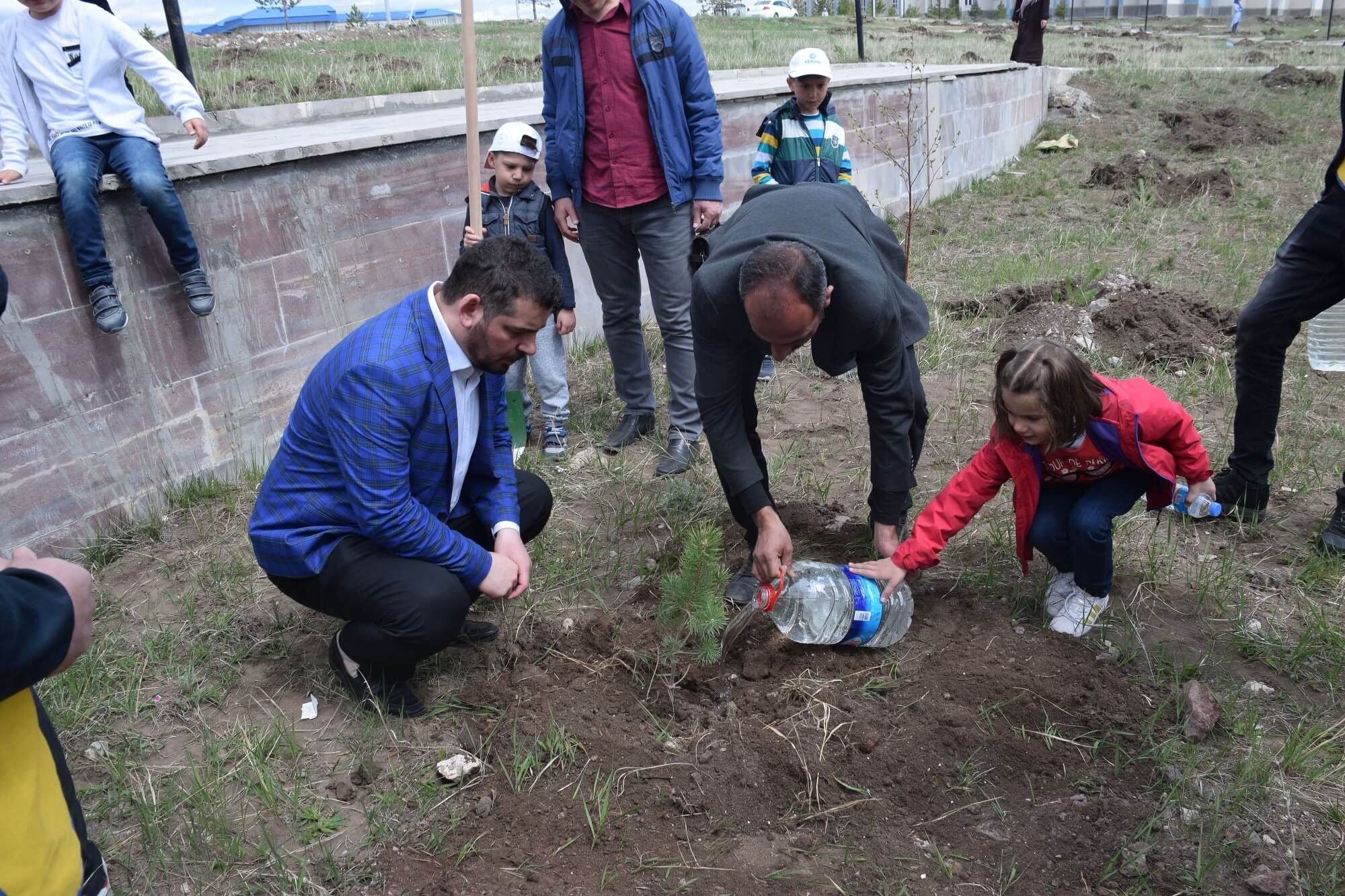 Kafkas Üniversitesi Davud-i Kars-i Cami çevresinin yeşillendirilmesinin hedeflendiği etkinlikte 400 sarı çam, 45 leylak, 35 kara ağaç, 35 dişbudak ve 35 akasya ağacı olmak üzere toplam 550 fidan çizilen peyzaj planına uygun şekilde toprakla buluşturuldu.