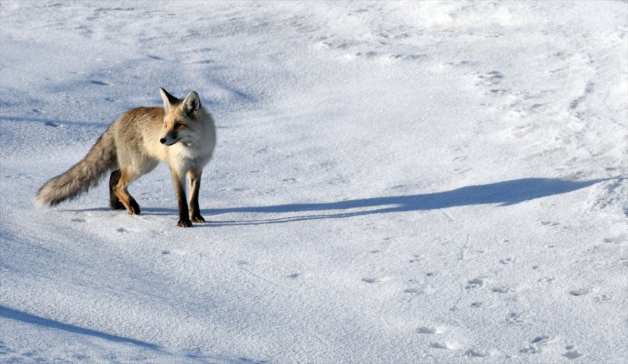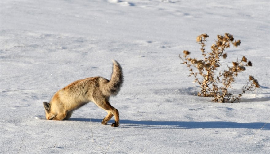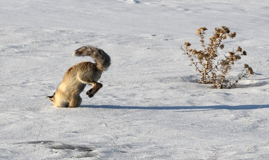 Kar kalınlığının 20 santimetreye, hava sıcaklığının ise gece sıfırın altında 12 dereceye kadar düştüğü ilçede, tilkiler kar altındaki fareleri avlamaya çalışıyor.