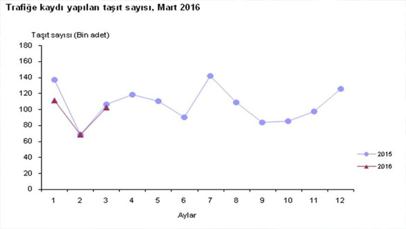Mart ayında geçen yılın aynı ayına göre trafiğe kaydı yapılan taşıt sayısında %4,2 azalış gerçekleşti. Bu azalış otomobilde %1,7, minibüste %29,8, otobüste %19,3, kamyonette %9,8, kamyonda %37,6, motosiklette %5,5 olarak gerçekleşti. Özel amaçlı taşıtlarda %1,6, traktörde ise %26,6 artış oldu.