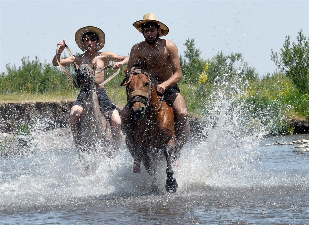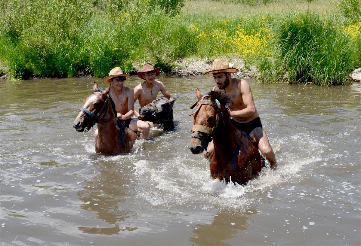 Güneşten etkilenmemek için fötr şapka takan gençler, köyün 500 metre yakınından geçen derenin yaklaşık 1,5 metrelik kısımlarında yüzdürdükleri atlarına, daha sonra dere boyunca kısa koşular yaptırıyor.