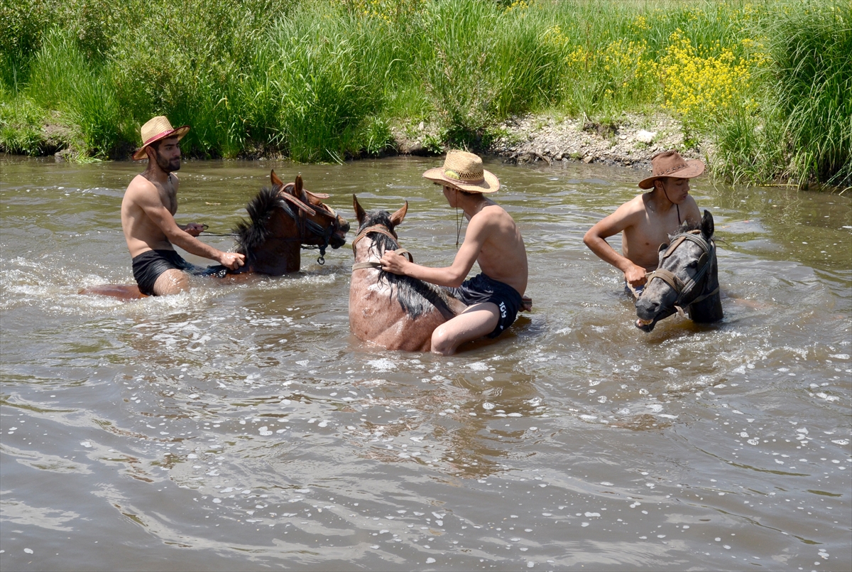 Hava sıcaklığının 30 derecenin üzerine çıktığı Kars'ta gençler, tarım ve yük taşımakta kullanılan atları günde üz kez dereye geçirerek serinletiyor.