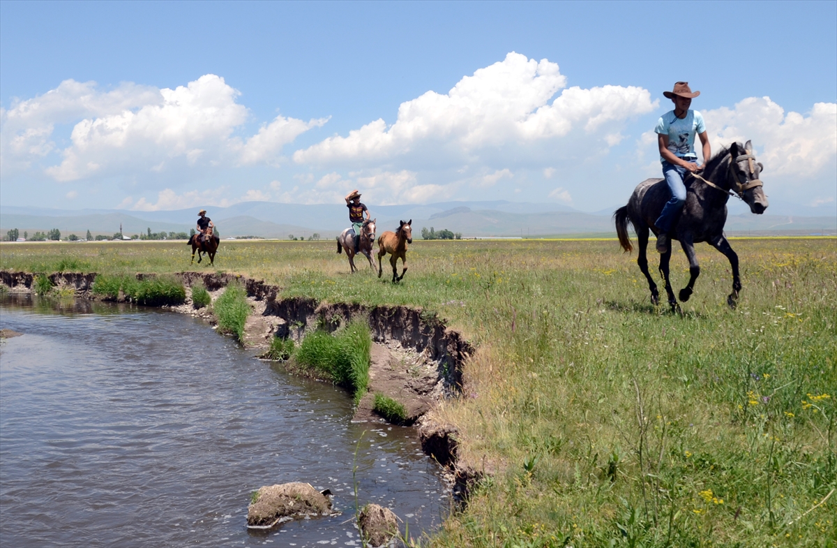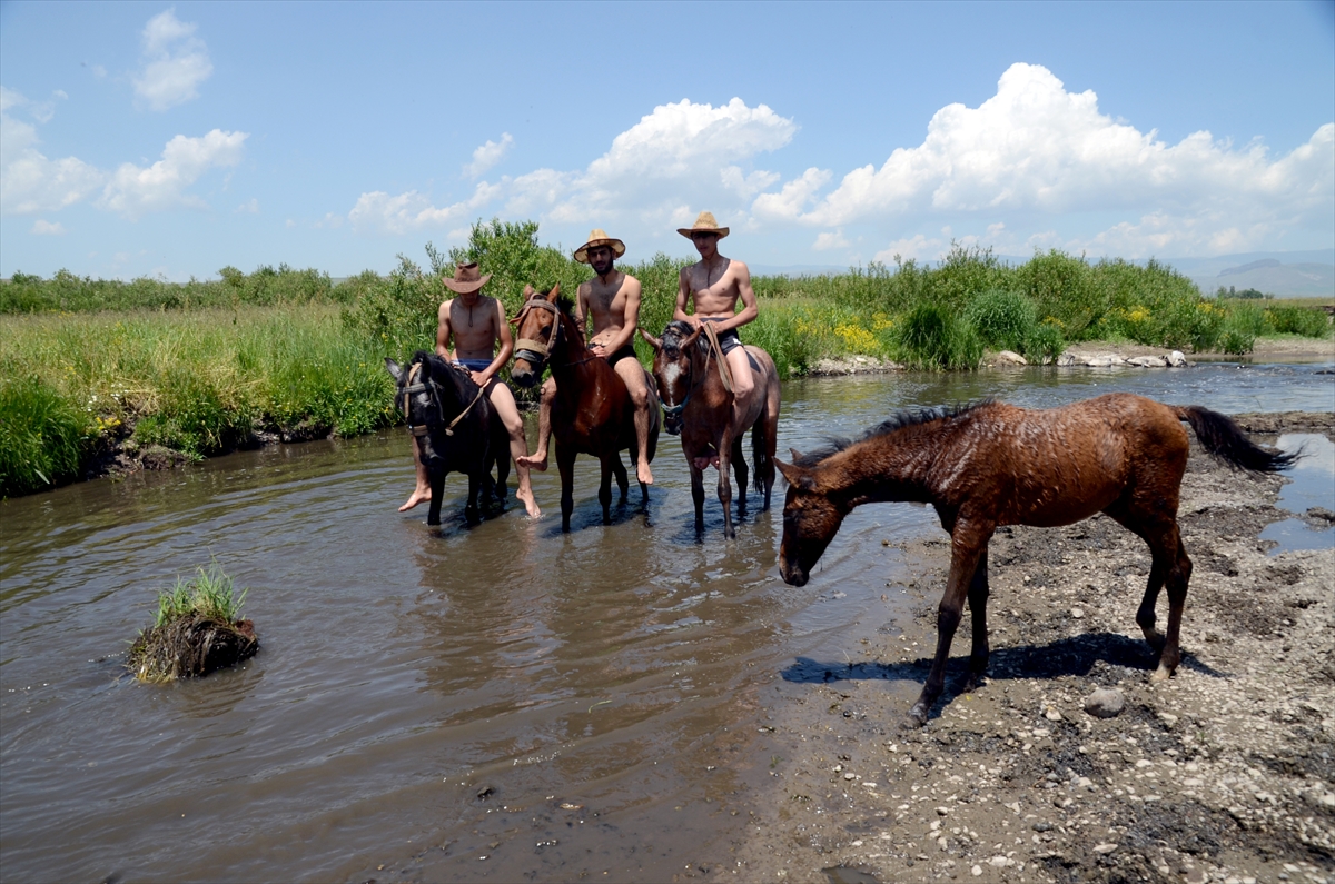 Selim ilçesi Karahamza köyündeki genç çiftçiler, 30 dereceyi aşan sıcaklıkta bunalan atlarını serinletmek amacıyla günde üç kez dereye götürüyor.