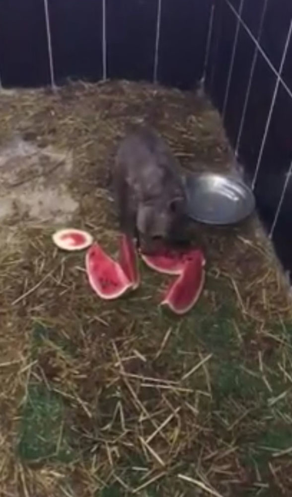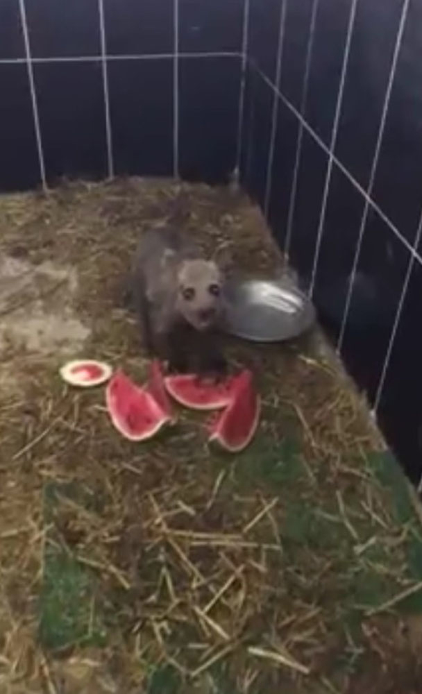 Kars Kafkas Üniversitesi Yaban Hayvanı Kurtarma ve Rehabilitasyon Merkezi’nde tedavisi devam eden yavru ayı, merkez çalışanlarının maskotu oldu. Yavru ayının sıcaktan etkilendiğini gören merkez çalışanları karpuz keserek ayıya verdi. Kendisine verilen karpuzu yiyen yavru ayı cep telefonuyla kaydedildi.