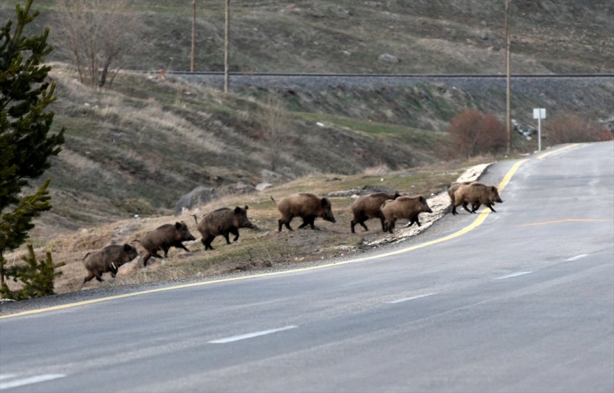Türkiye'nin en yüksek yerleşim yerlerinden Sarıkamış ilçesinde, yiyecek bulmakta zorluk çeken yaban domuzları ilçe yakınlarında yiyecek aradı.
