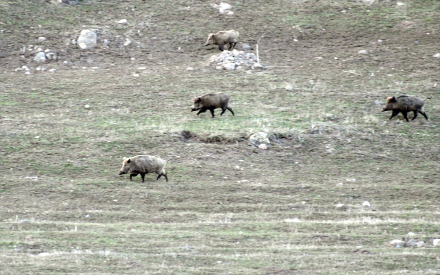 Kars'ın Sarıkamış ilçesinde, baharın gelmesiyle yiyecek aramaya çıkan yaban domuzları ilçe yakınlarında sürü halinde görüntülendi.