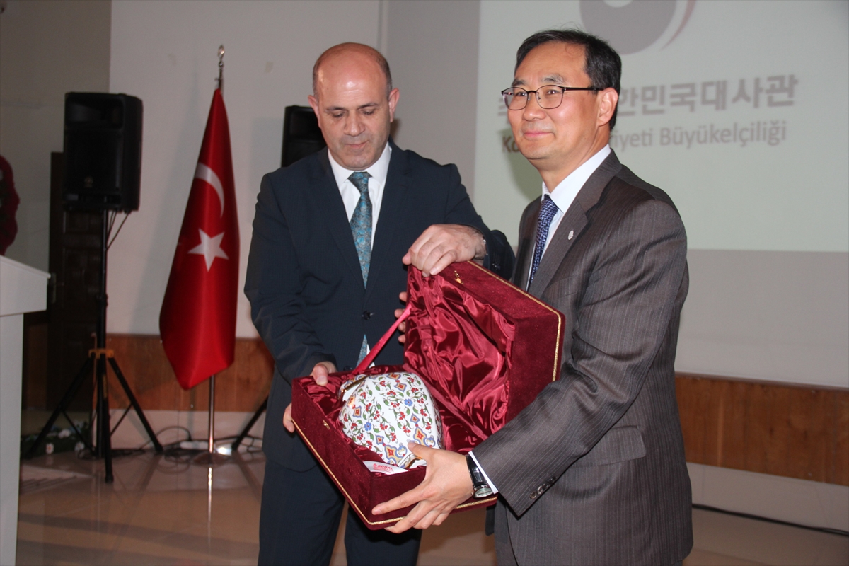Konuşmaların ardından Rektör Prof. Dr. Özcan, Büyükelçi Yunsoo'ya hediye takdim etti.
