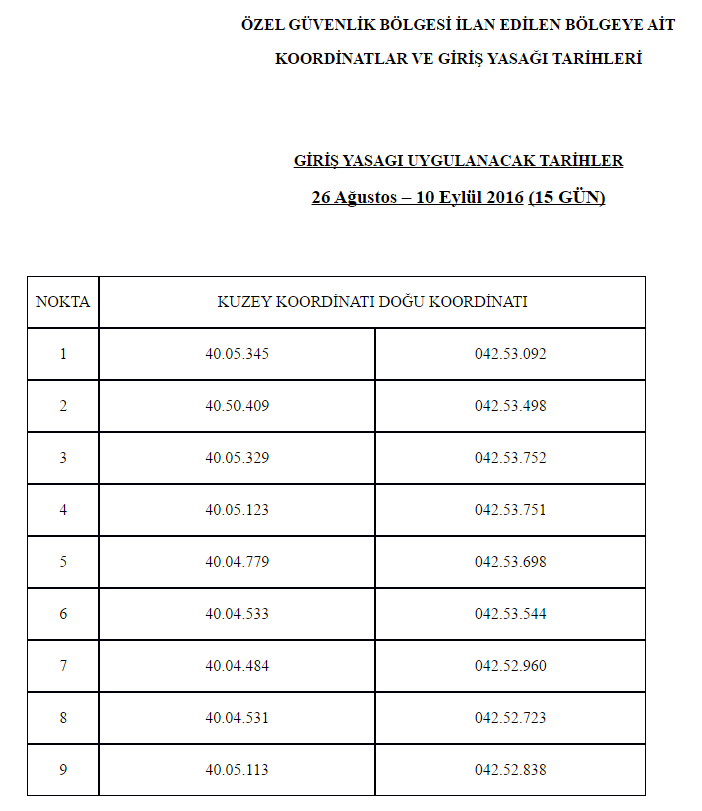 Kars ili Kağızman ilçesi sınırları dahilinde bulunan ve aşağıda koordinatları belirtilen bölge, 12 - 26 Ağustos 2016 tarihleri arasında (15 gün süreyle) özel güvenlik bölgesi ilan edilmiştir.