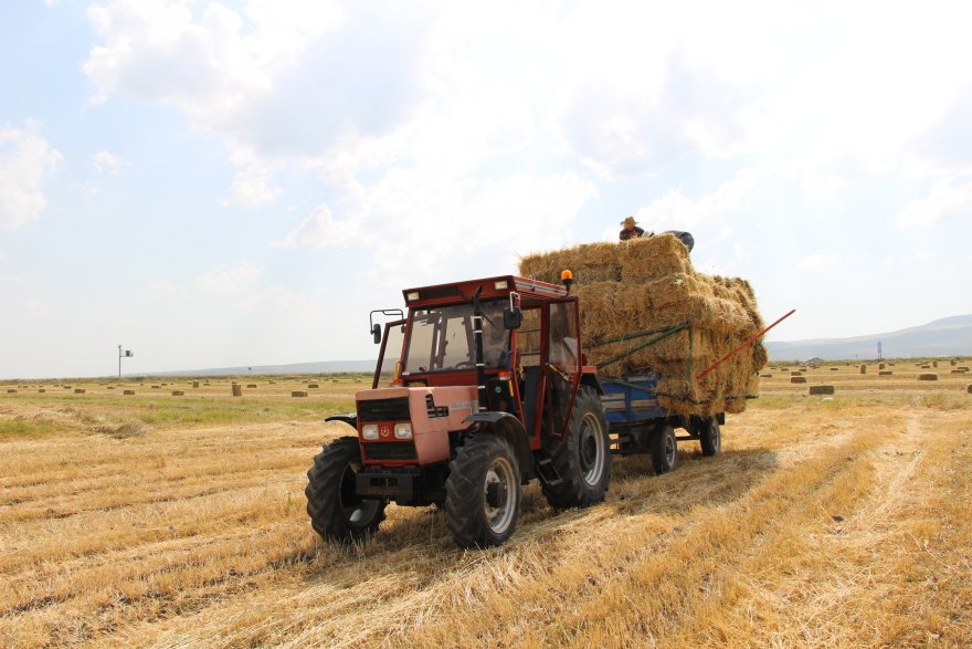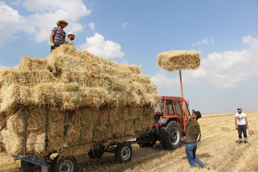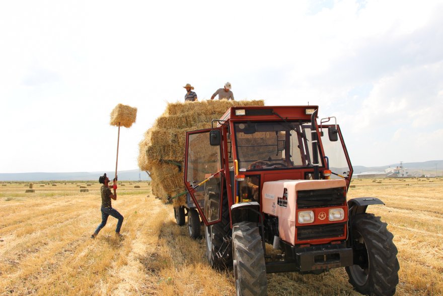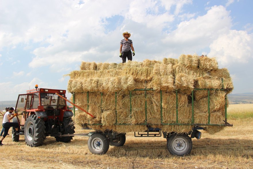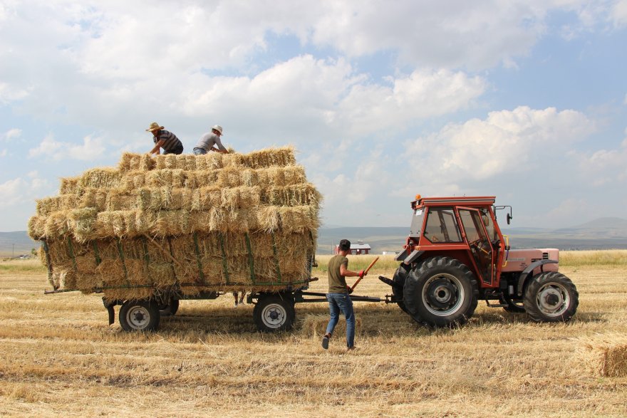 Yazın kavurucu sıcağına rağmen hayvanları için kış hazırlıklarını sürdüren çiftçiler, bir hafta önce biçtikleri ve balyalanan otları 32 derece sıcağa aldırış ellerindeki dirgenler traktör römorkuna yüklüyor.