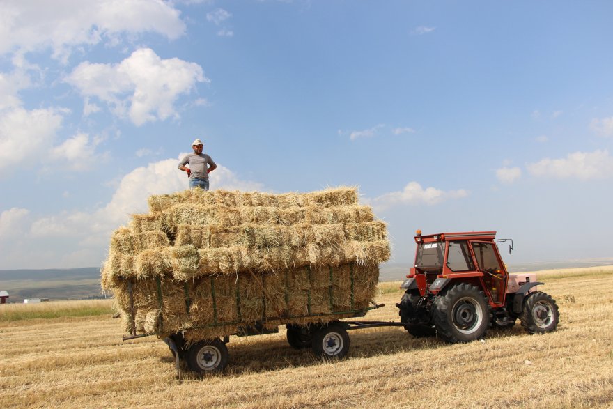 Öte yandan Kars’ta etkili olan ve 32 dereceyi bulan hava sıcaklığında güneş altında çalışan çiftçiler, aşırı sıcaklardan dolayı dinlenerek çalışıyor. Çiftçilerden bir kısmı balyalanmış otları dirgenler traktöre taşırken, traktör römorkunda bulunan çitçiler ise otları yerleştiriyor.