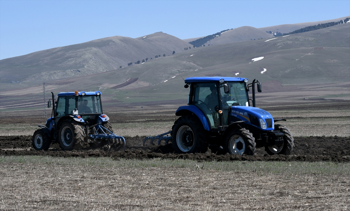Gök, ilçede yaklaşık 350 bin dönüm tarım arazisinin bulunduğunu, yılda 300 bin dönüme yakın arazinin ekildiğini belirterek, "2 bin rakımda olduğumuz için diğer il ve ilçelerden bir ay sonra ekime başlıyoruz. Şu anda tohumları ekmeye başladık. Gördüğünüz gibi dağlarda karlar halen duruyor." dedi.