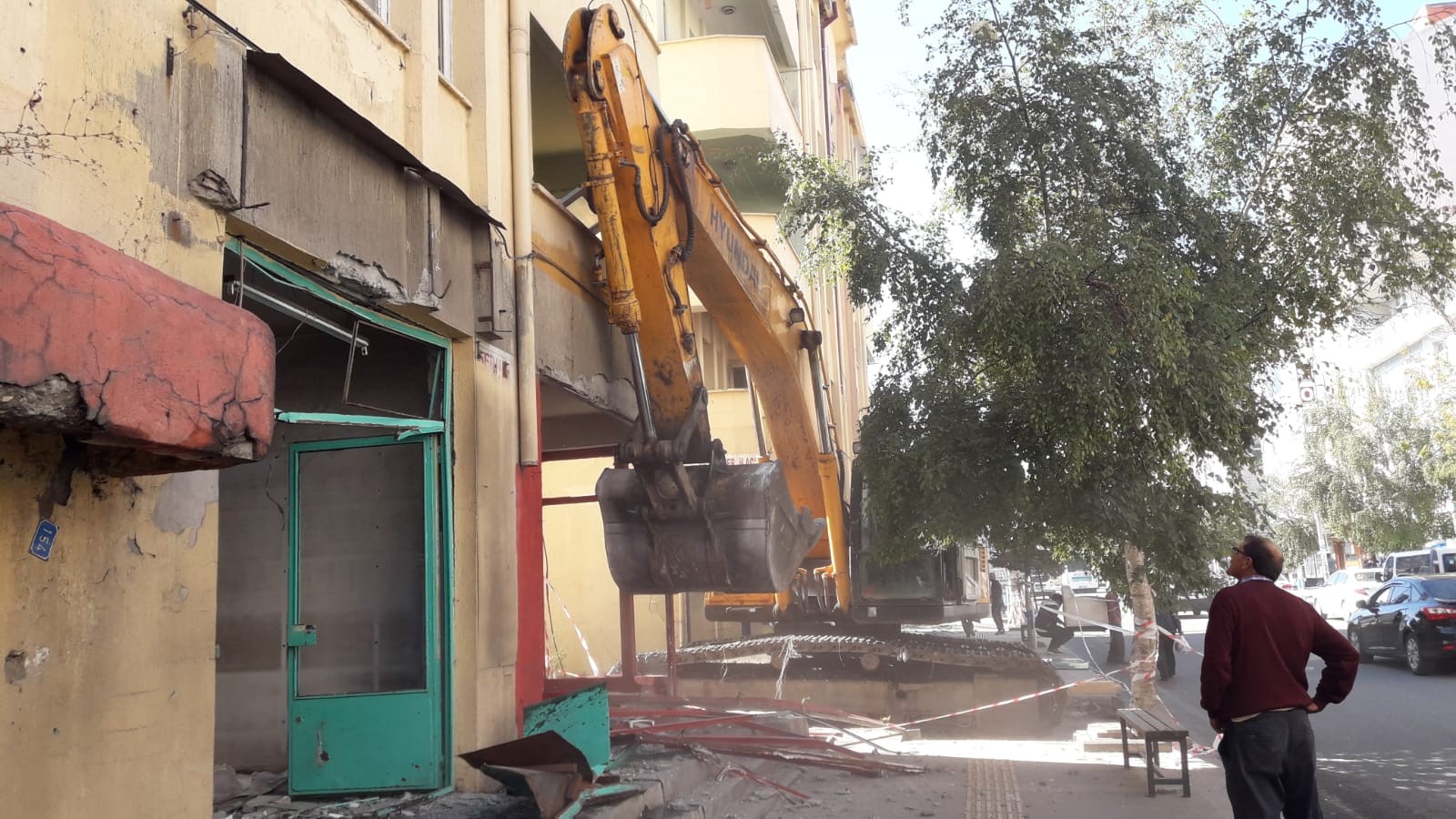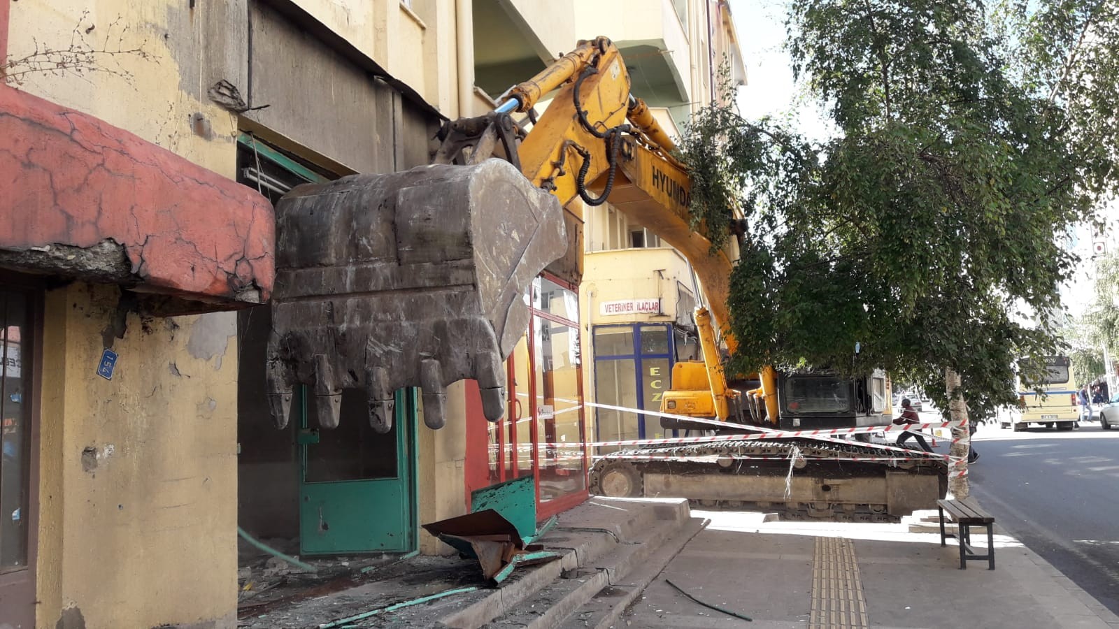İş makineleri tarafından binanın yıkımına başlanılırken, güvenlik gerekçesiyle bölge şeritlerle çevrildi.