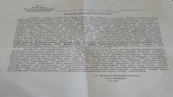 Avukat Ahmet Gürol Şağban, İHA’ya yaptığı açıklamada, kararın Gemerek Asliye Hukuk Mahkemesi için de emsal teşkil edebileceğini savunarak, “15 Mayıs 2016 tarihli MHP Olağanüstü Büyük Kongresinin durdurulması kararına karşı yapılan itiraz sonucu, Tosya Asliye Hukuk Mahkemesinin verdiği ihtiyadi tedbir kararının ortadan kalkmış olduğu gerekçesiyle Ankara 25. İcra Müdürlüğü kararın infaz edilemez olduğuna karar vermişti. Böylelikle 15 Mayıs 2016 tarihinde yapılacak olan MHP Büyük Kongresi önündeki Tosya engeli kalkmıştır. Kararın MHP camiasına ve Türk milletine hayırlı olmasını diliyorum. 15 Mayıs’ta milliyetçi, ülkücü iradenin Ankara’da tecelli edeceğine inanıyorum” dedi.