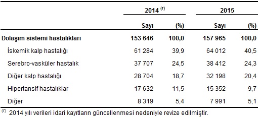 Dolaşım sistemi hastalıkları nedeniyle gerçekleşen ölümlerin 2015 yılında %40,5’i iskemik kalp hastalığından, %24,3’ü ise serebro-vasküler hastalıktan kaynaklandı.