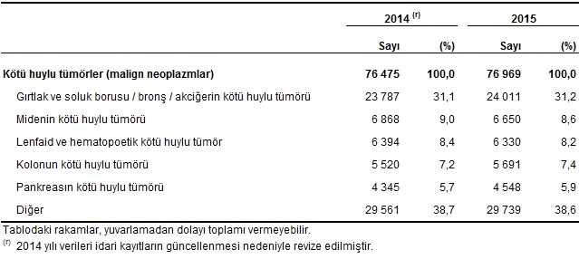 Kötü huylu tümör nedeniyle gerçekleşen ölümlerin toplam sayısı 2014 yılında 76 bin 475 olurken, 2015 yılında 76 bin 969 olarak tespit edildi. 2014 yılında bu ölümlerin %31,1’i, 2015 yılında ise %31,2’si gırtlak ve soluk borusu/bronş/akciğerin kötü huylu tümöründen kaynaklandı.