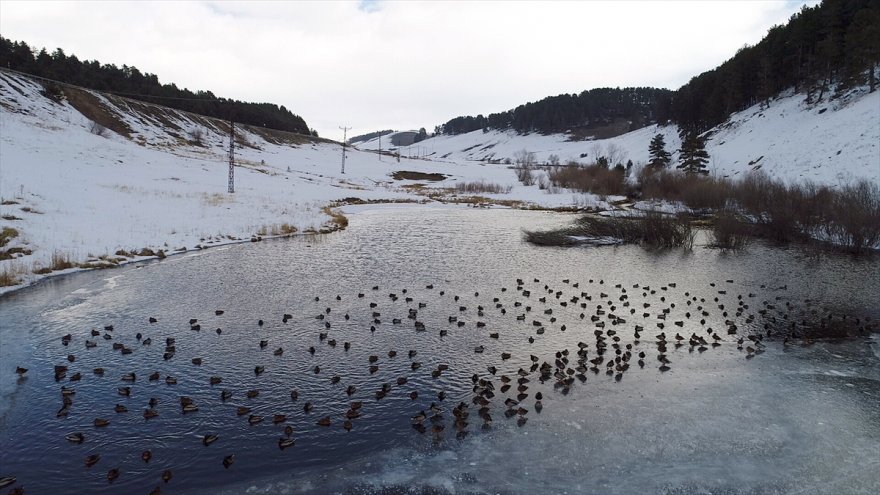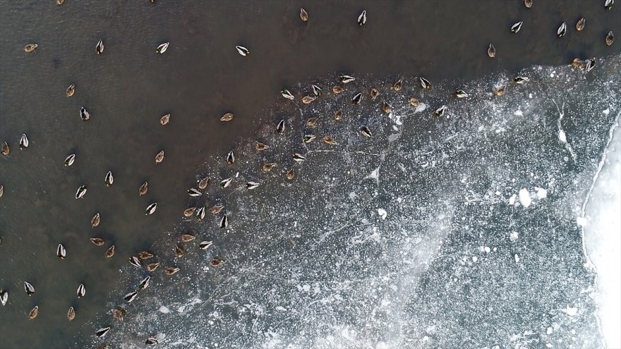 Göldeki ördekler, büyük bölümü buz tutan gölün donmayan kısımlarında yüzmeye ve beslenmeye çalışıyor.