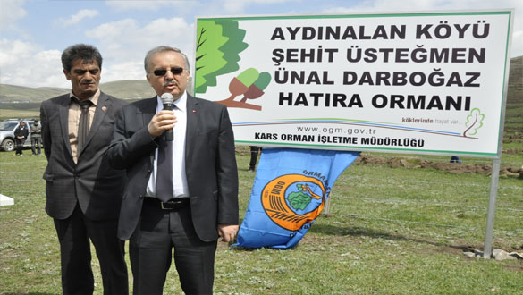 Şehit Ünal Darboğaz’ın adının sonsuza kadar yaşayacağını da konuşmasına belirten Aydınalan Köyü Muhtarı Mehmet Bulut: “Köyümüz büyük bir acı yaşadı. Köyümüzün yetiştirdiği değerli bir evladımız şehit oldu. Tüm halkımız gibi, bu acı bizleri de yüreğimizden yaraladı. Şehidimizin adını sonsuza kadar yaşatmak bizler için görev oldu. Bu yüzden de şehidimizin ailesinin onayını aldıktan sonra burada yeşerecek ve yaşayacak ormanımızla beraber Ünal'ımızın adı da sonsuza kadar yaşayacak. Bu konuda bizlere anlayış gösteren ve bizleri destekleyen başta şehidimizin annesi ve ailesine sonsuz şükranlarımızı sunuyoruz. Onların evladının ismi artık köyümüzün ormanında bizimle beraber sonsuza kadar yaşayacaktır. Köyümüze bu güzelliği katmak için çalışmaları başlatan ve desteğini bizlerden hiçbir zaman esirgemeyen başta Sayın valimiz olmak üzere, Kars Orman İşletme Müdürlüğü çalışanlarına, değerli köylülerime ve emeği geçen herkese şükranlarımı sunuyorum. Şunu da belirtmek isterim ki burada harcanan emeğe sonuna kadar sahip çıkacağız ve ormanımıza gözümüz gibi bakacağız.” Diye konuştu.