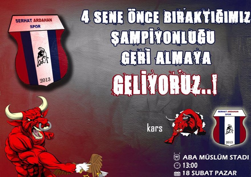 18 Şubat Pazar günü saat 13:00 da Kars Kafkas Üniversitesi Aba Müslüm Güven Stadında oynanacak olan Kars 36 Spor- Serhat Ardahan spor maçı öncesi Serhat Ardahan Spor dostluk ve kardeşliğin pekişmesi için mücadele etmesi gerekirken resmi facebook hesabı üzerinden, “Kars’ta Bıraktığımız Şampiyonluğu Almaya Gidiyoruz” başlığı adı altında taraftarlarına özellikle bu maça gelmelisiniz diye bir açıklama yaptı.