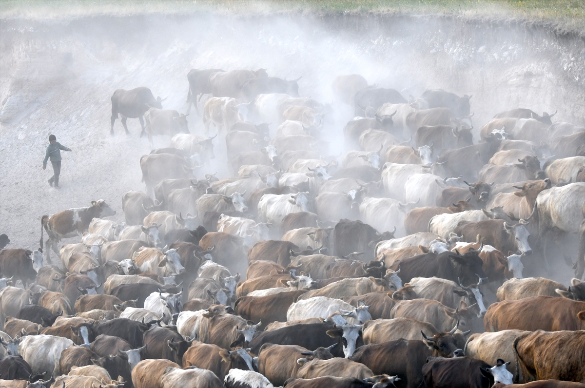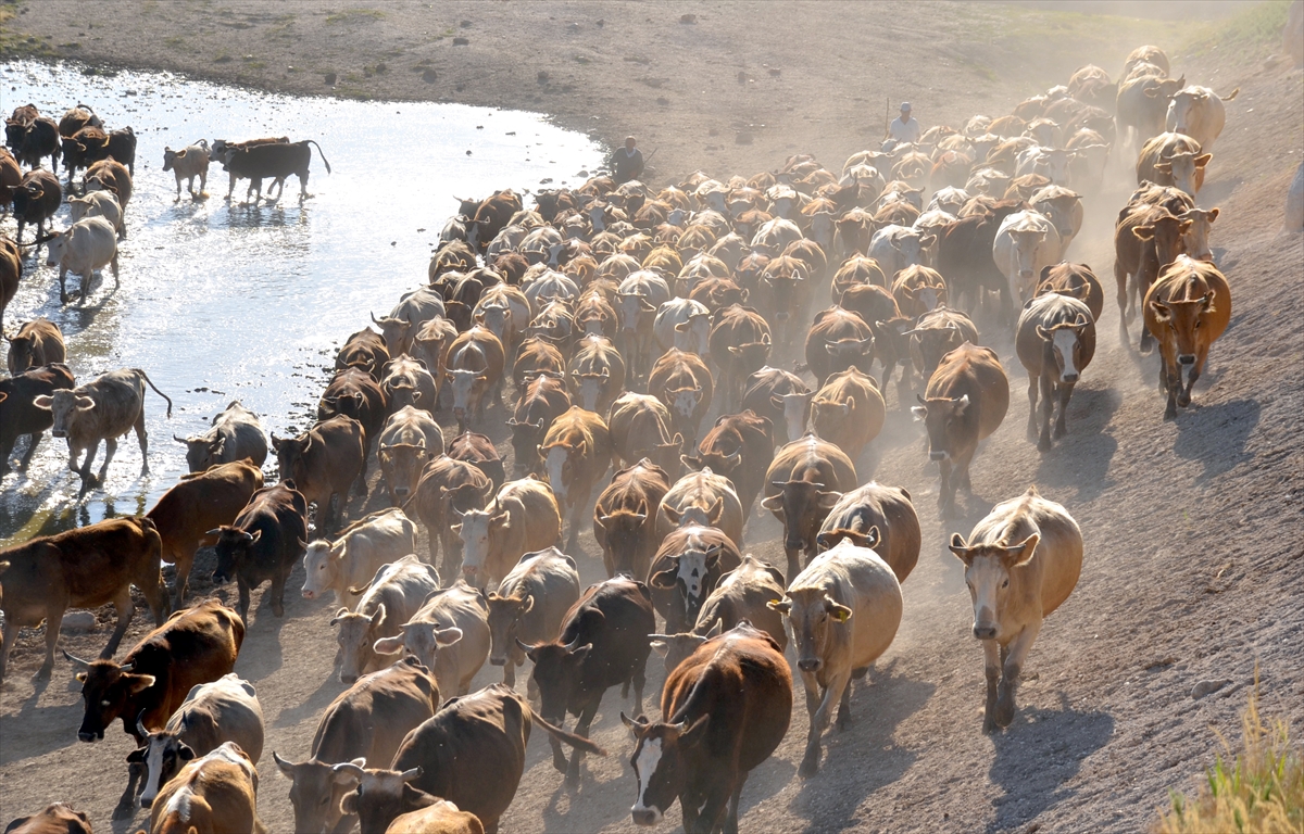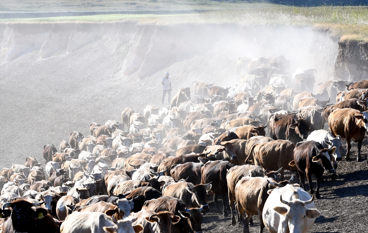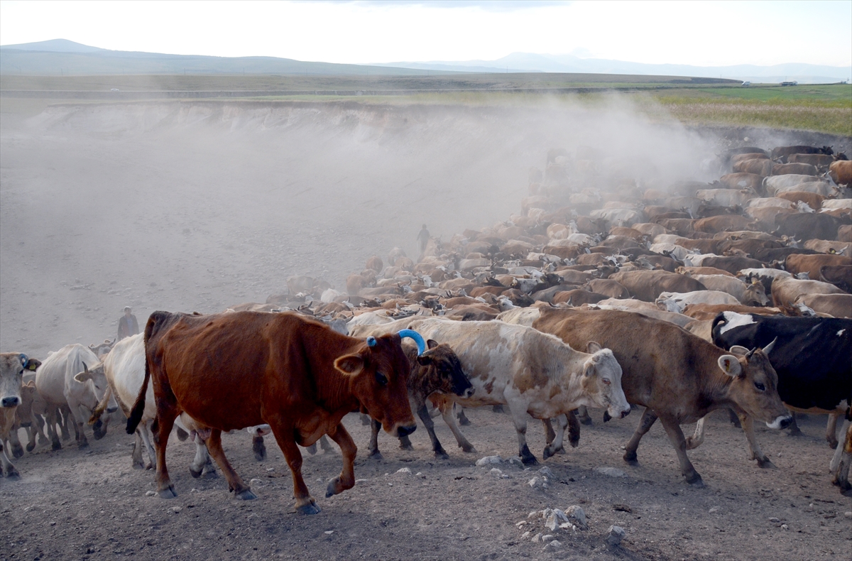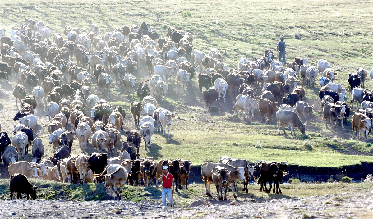 Sarıkamış ilçesine bağlı Alisofu köyünde sabah erken saatlerde, çobanlar eşliğinde yol çıkan yüzlerce büyükbaş hayvan, 2 bin 500 rakımlı meralarda otlatılıyor.