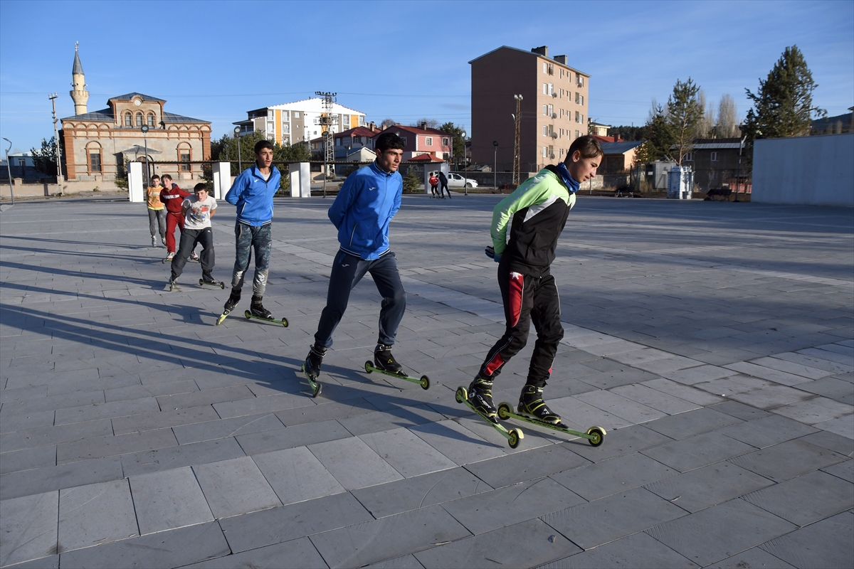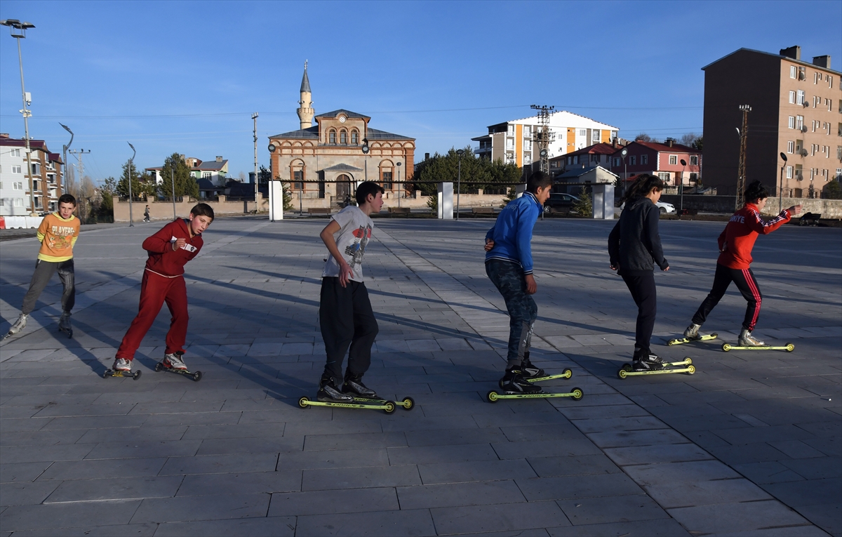 İlçede kayaklı koşu branşında mücadele eden yaklaşık 30 sporcu, asfalt antrenman pisti olmadığı için çalışmalarını Sarıkamış Kaymakamlığı önünde yeni inşa edilen tören alanında yapıyor.