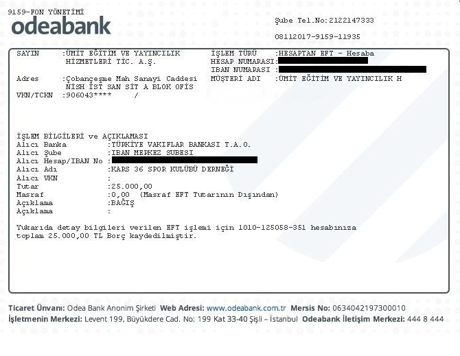 Mektebim Okulları’nın Kurucusu ve Yönetim Kurulu Başkanı Ümit Kalko’nun Kars 36 Spor’a yaptığı bağış banka dekontları kamuoyuyla paylaşıldı.