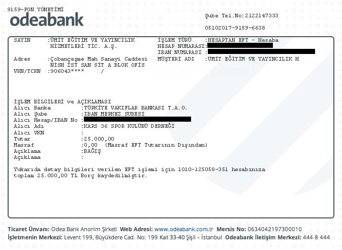 “Kars 36 Spor Yönetimi tarafından sosyal medya hesaplarından ve çeşitli mecralardan Karslı iş adamlarının kulübe herhangi bir destek vermediğine dair yapılan paylaşımlar üzerine 75 bin TL’lik bağış yaparak kulübe destek verme kararı alan Sayın Ümit Kalko’nun gerçekleştirdiği bağışın dekontları paylaşılan şekildedir.”
